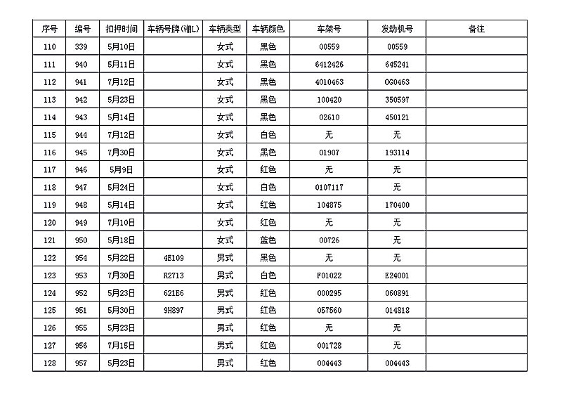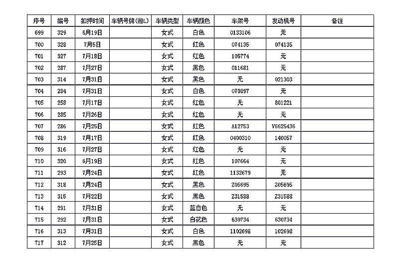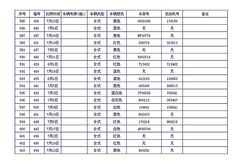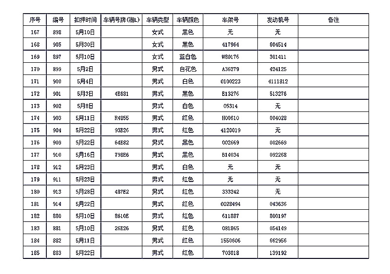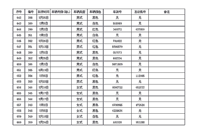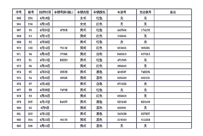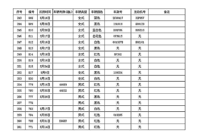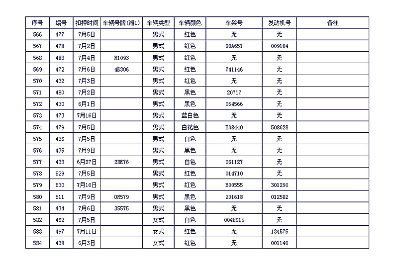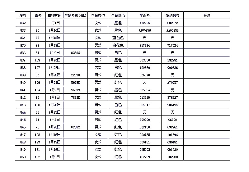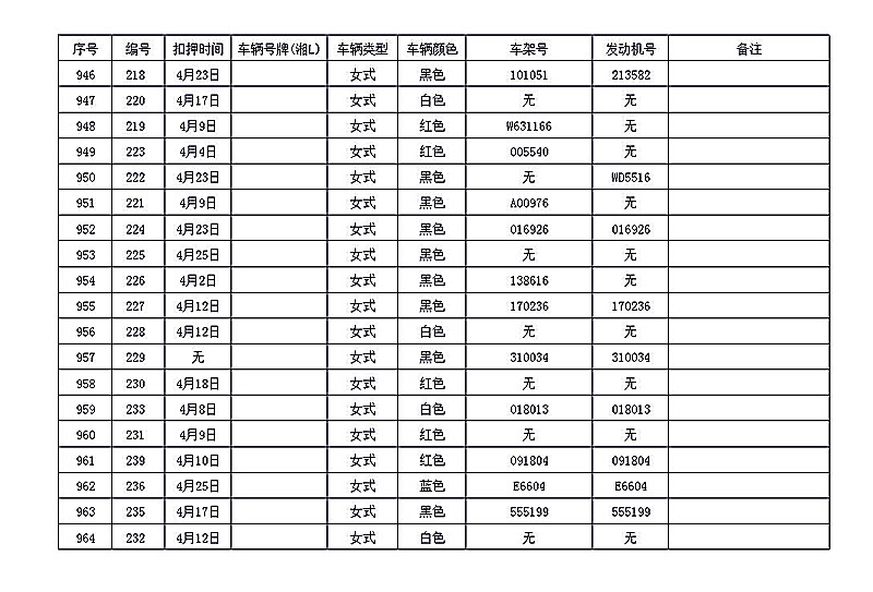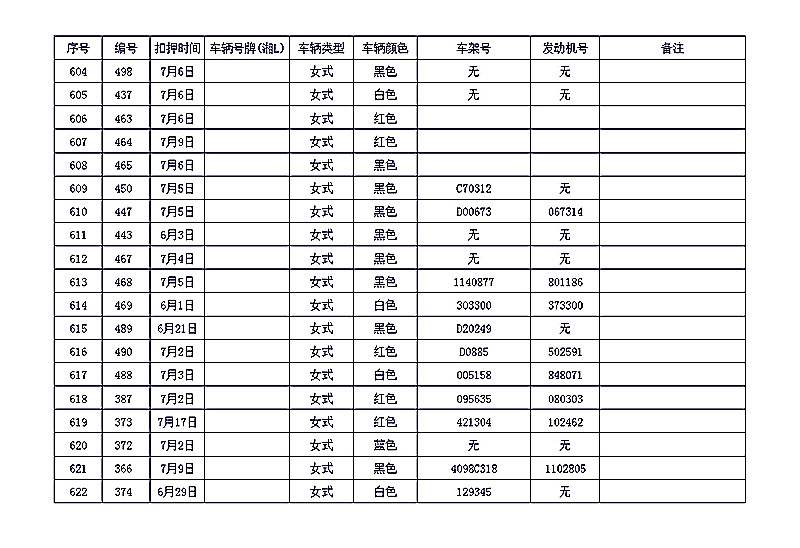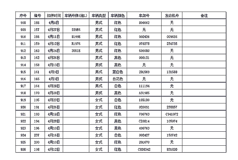 桂阳县公安局交警大队在交通执法中依法查扣了一批违法、违章车辆(详细资料见附表),现将这些车辆予以公告。请被公告车辆的车主或车辆所有人自公告之日起三个月内持身份证、行驶证等有效证件到桂阳县公安局交警大队进行处理,逾期不办理的,公安机关交通管理部门将根据《中华人民共和国道路交通安全法》和《机动车强制报废标准规定》的相关规定予以处置。