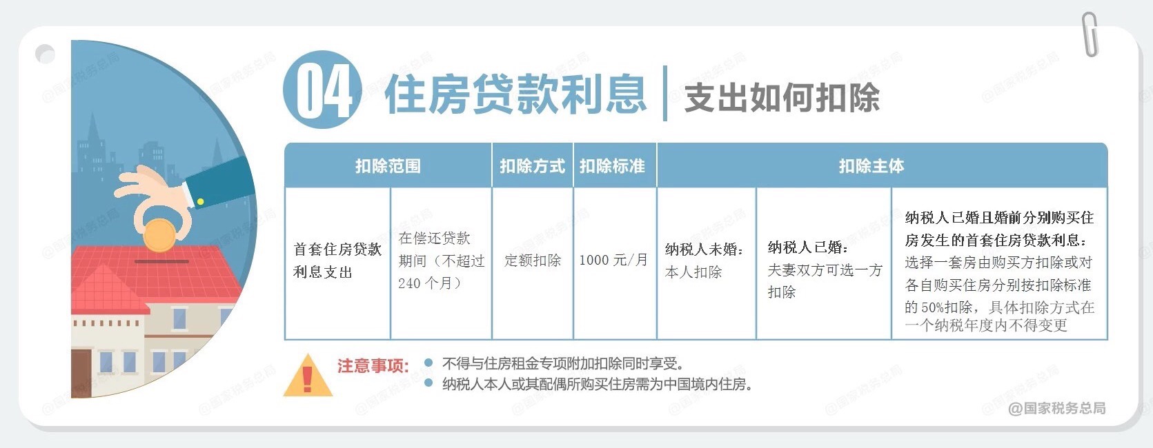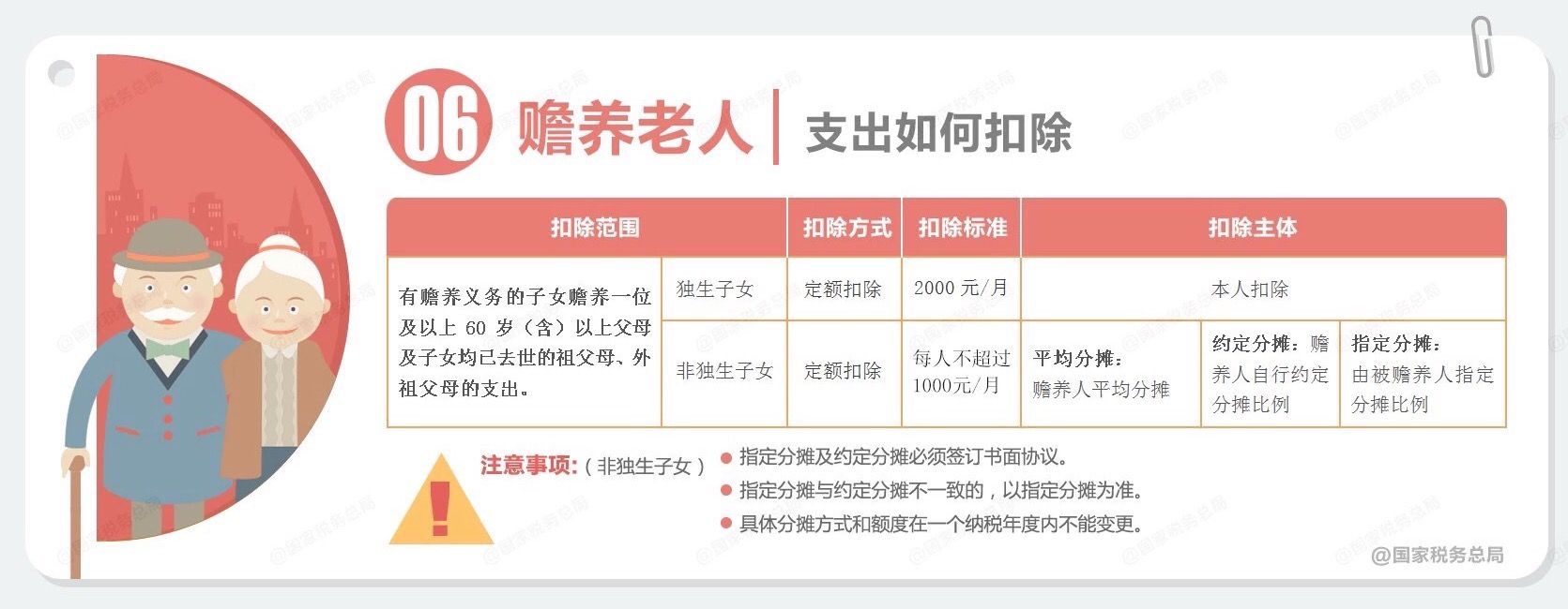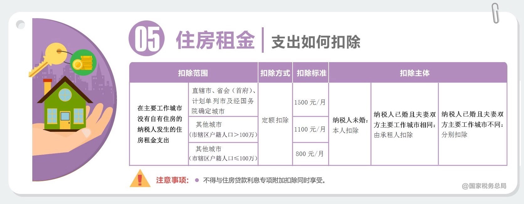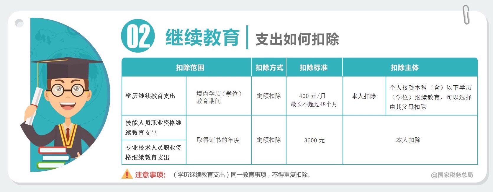 2019年1月1日起,纳税人计算个税应纳税所得额时,在5000元基本减除费用扣除和“三险一金”等专项扣除外,还可以享受子女教育、继续教育、大病医疗、住房贷款利息或住房租金,以及赡养老人等6项专项附加扣除。具体扣缴如图所示:
