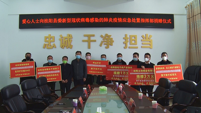 2月5日, 锦相百货、太和辣业有限公司、县坛子肉产业协会和县委统战部、县工商联、县创建办干部职工向县委新型冠状病毒感染的肺炎疫情应急处置指挥部捐款113099元,桂阳爱眼眼镜城捐献医用护目镜204副。