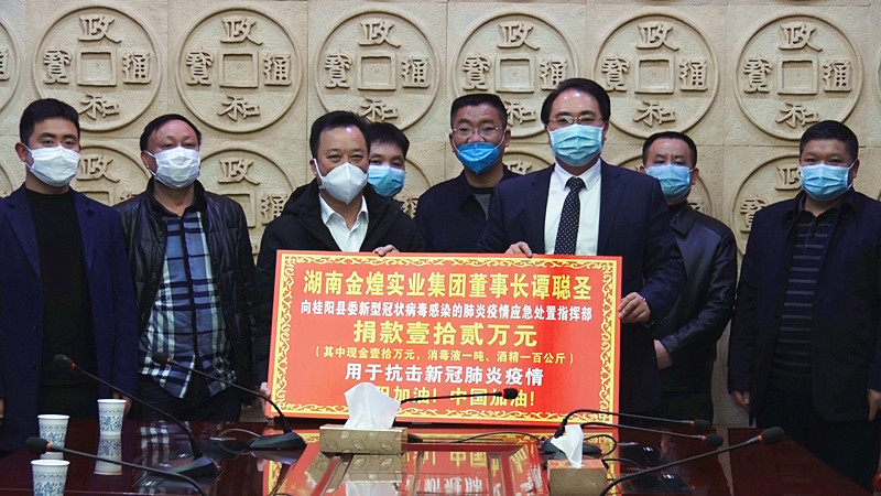 2月2日,湖南金煌实业集团董事长谭聪圣向应急处置指挥部捐款10万元及消毒液1吨、酒精100公斤,全力支持我县抗击疫情。同时,该集团加强疫情防控各项措施,周密部署特殊时期供燃工作,确保市民安全用气。