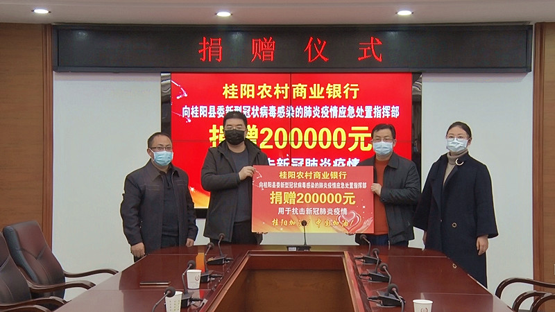 此前,桂阳农商银行向应急处置指挥部捐赠了20万元爱心善款;中国人寿桂阳支公司无偿捐赠医用口罩1万个,并为一线防疫人员每人免费赠送保额价值30万元的爱心保险一份;桂阳浩丰贸易商行捐赠牛奶60件、八宝粥300件、芝士198件。