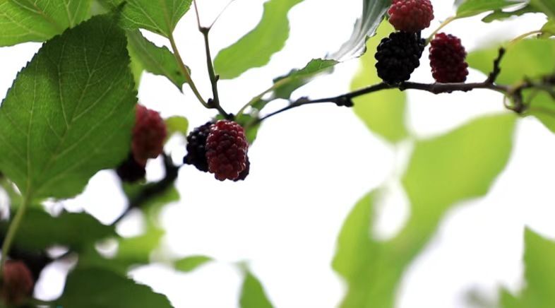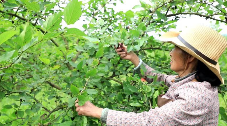 走进桑葚采摘园,只见翠绿的枝头上,密密麻麻挂满了一串串或深紫、或樱红的桑葚果实。在郁郁葱葱的桑树下,果农、游客手提小篮,穿梭其中,瞅准紫色的果实,抓住果实连在枝丫的茎杆,用力一揪,桑葚果便顺利采下。空气中,弥漫着桑果成熟后的果香,游客们一边采摘桑果,一边品尝,体验着初夏乡村游的快乐。