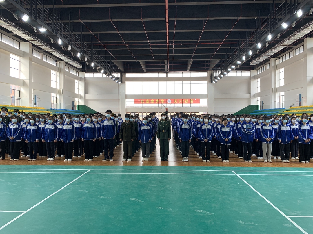 在甘甜中学体艺馆,参加入团仪式的105名学生整齐列队,依次上台领取团徽、团员证,校领导为新入团学生佩戴团徽。