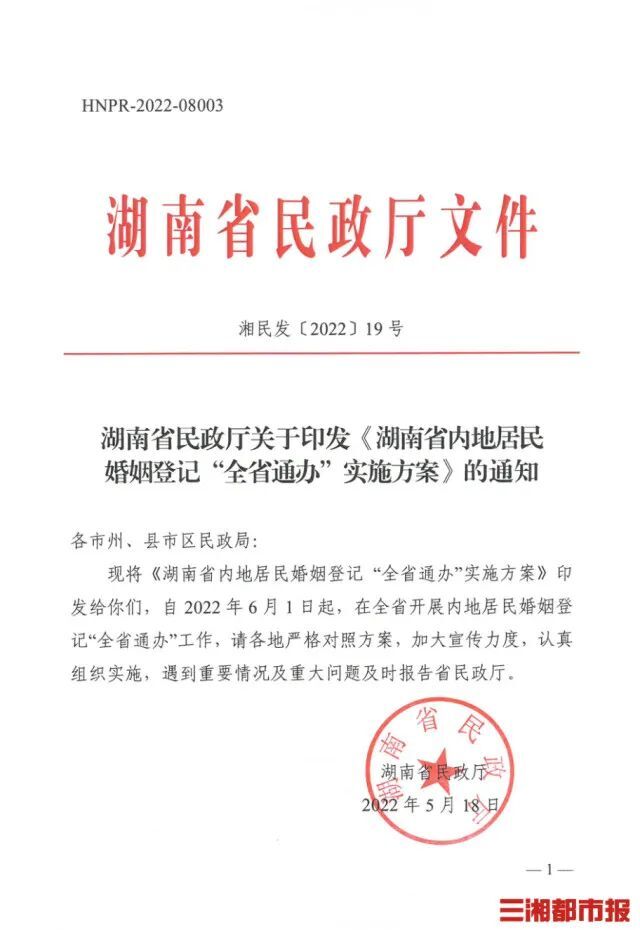 5月18日,记者从湖南省民政厅获悉,自2022年6月1日起,将在全省开展内地居民婚姻登记“全省通办”工作,以加快实现省内异地办理婚姻登记,推进基本公共服务均等化,为广大群众提供更加优质、便捷、高效、温情的婚姻登记服务,进一步提升广大群众的幸福感、获得感和满意度。