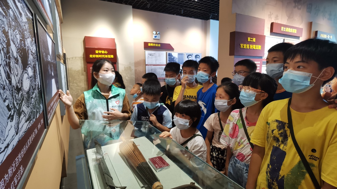 不仅要“学得会”,还要让书本知识“活”起来。随后,返乡大学生们化身“讲解员”,为孩子们讲述了红军长征“夜宿梨山 秋毫无犯”的故事。“在他们又饥又渴的情况下,他们非但没有摘下百姓们的一颗梨子,反倒把所有的梨子都帮百姓捡拢起来,然后归还给了他们,这体现的就是‘军爱民,民拥军’的军民鱼水情深。”返乡大学生陆紫霞深情地为孩子们讲解道。