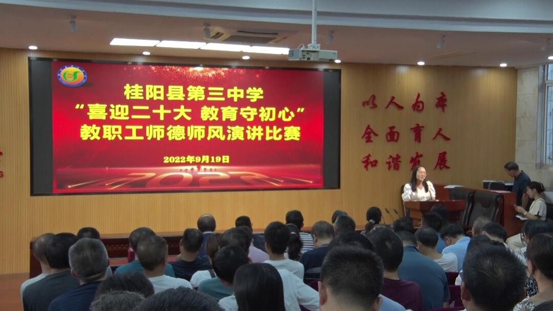 新桂阳9月20日讯(记者 谢新阳)为全面推动师德师风建设走深走实,团结动员广大教职工为建设现代化新桂阳建功立业。9月19日,桂阳三中举行“喜迎二十大,教育守初心”教职工师德师风演讲比赛。