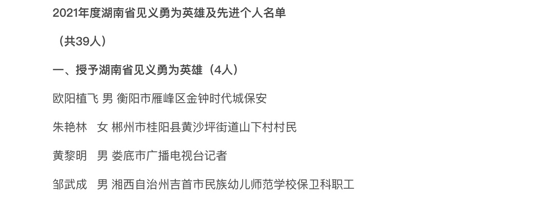 新桂阳10月19日讯(记者 廖诗卉 黄磊 )日前,湖南省人民政府发布2021年度湖南省见义勇为英雄及先进个人名单,我县“中国好人”朱艳林获评“湖南省见义勇为英雄”。2021年10月3日,朱艳林在上班时发现一名女童疑似被拐,当即骑车一路跟随,成功解救了被拐骗的三岁女童,挽救了一个家庭。
