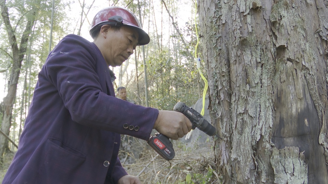 “我今天吃了早饭来给树打药水,到现在搞了20多棵,因为山上路程有这么远,材料搞来,每棵树大概需要40分钟左右。”施工人员卢正德说。