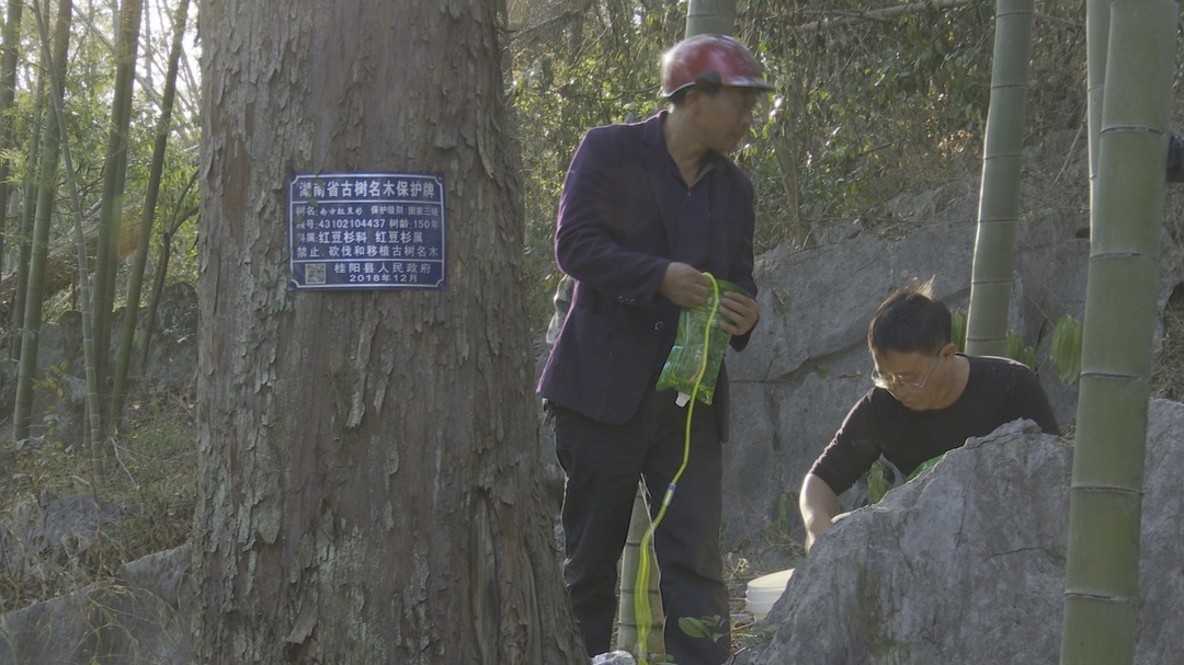 桂阳南方红豆杉柔毛油杉省级自然保护区管理站副站长何二桂介绍道,“目前我们采用的方法, 一个是挂营养液, 提高红豆杉的抗旱能力,第二个是跟它(红豆杉)根部进行水的点灌,让它慢慢地保持树干和根部的适当的水分,保障它在旱情结束之前能够坚持。”