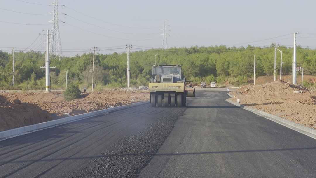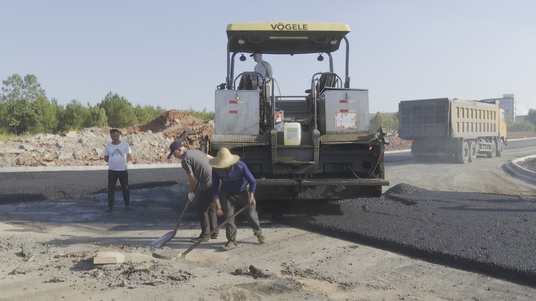当天,在桂阳高新区有色科技产业园上海电气厂门前,沥青铺路机将滚烫的沥青混合料均匀的铺设到路面,工人们拿着铲子,跟在后面填补着边边角角,紧跟着的压路机快速地将路面压实,照此进度,再过一天即可将这条路修建完毕。