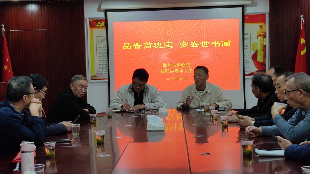 郴州市博物馆馆长郑延庆先生认真听取了大家观简后的体会发言,并作了重要讲话,他说:"郴州出土的桂阳郡西晋时期的简牍让全国乃至全世界震惊,这对于我们研究西晋时期的政治、经济、文化等诸多方面非常重要的作用。为让郴州西晋简牍文物发挥更大的作用,接下来我们将会有一系列的举措……"他还说:"桂阳县老年大学是郴州市各县市中第一个组团来参观晋简的单位,这充分说明桂阳人热爱本土历史文化,注重文化的传承,这是值得各兄弟县市学习的"。郴州市艺术收藏家协会副主席、书法家应涛先生还为大家作了《郴州西晋简牍在中国书法史上的地位》专题讲座,更让学员们深受启迪。