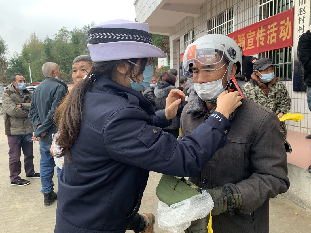 为了进一步引导摩托车驾驶员树立“头盔就是保命盔”的意识,现场还组织观看了交通安全警示片,让村民深受感触和教育。宣讲结束后,县交警大队免费发放了100余顶安全头盔。