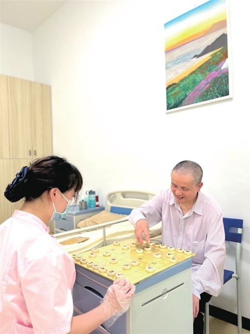 △桂阳县厚思养老服务中心工作人员陪康复老人下象棋。
