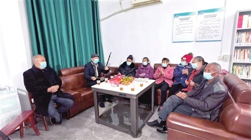△桂阳县仁义镇五美村医养结合服务站,老人齐聚一堂,76岁的朱俊义用二胡演奏《刘海砍樵》。