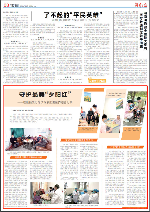 在加快建设的养老服务体系中,推进医疗卫生与养老服务相结合是重要惠民举措。近年来,桂阳县结合实际先行先试,积极探索推进医养结合的有效形式。2022年,桂阳县被评为“湖南省医养结合示范县”,成功加入科技部“国家医养结合支持解决方案研究项目”。