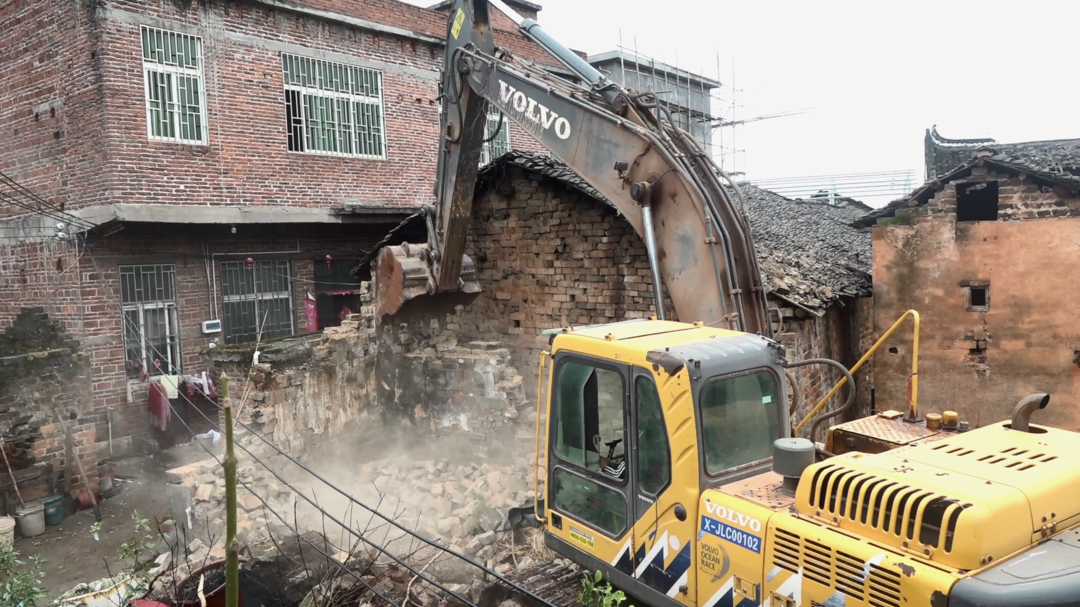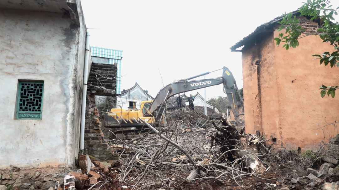 在流峰镇松市村,挖掘机正在对闲置多年的空心房进行拆除作业。农村空心房由于年久失修,砖头松动、屋顶破损,严重影响村容村貌,也对村民安全造成危害,“空心房”被拆除后,将有利于美丽乡村建设。