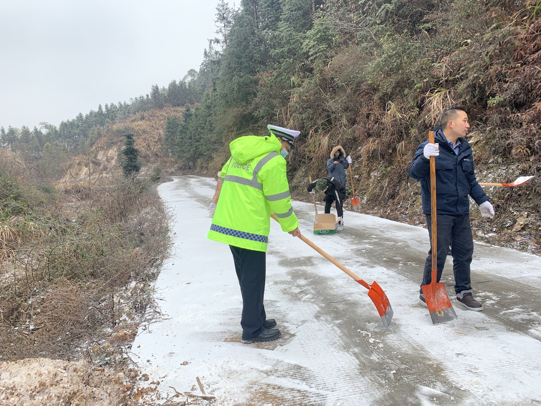 在国道G234新田县磨刀岭至白水瑶族乡江友村路段,乡政府工作人员及公安交警、村民志愿者正顶着寒风进行除冰作业,他们手拿铁锹沿着道路清理积雪与杂物,并在沿途抛洒工业盐进行融冰,消除道路安全隐患。