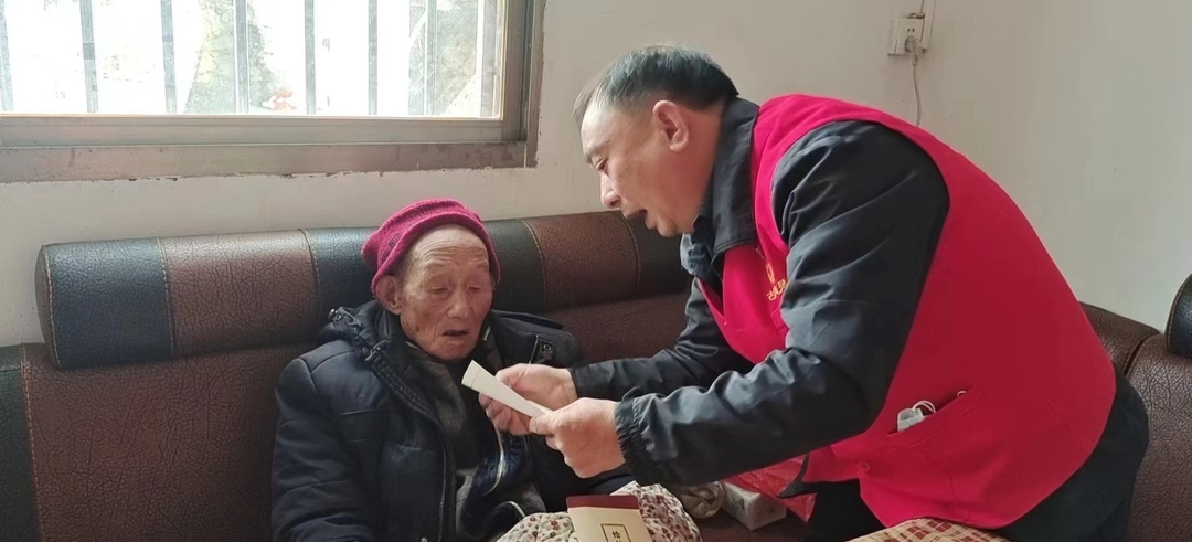 在舂陵江镇抗战老兵欧阳文爷爷家中,志愿者为爷爷带来了米、油、扣肉等生活物资,还有一封给抗战老兵的新春家书。志愿者们详细询问老人的身体状况和生活需求,倾听他们的抗战往事,向他们表示崇高的敬意。欧阳文于1921年出生,1942年参军,参加过抗日战争、抗美援朝战争,党龄已有70年。除看望健在的抗战老兵外,志愿者也给抗战老兵遗孀送去了慰问。为她们送来特殊的“定制”春联、红包和年货,让她们感受到来自社会各界的关爱。