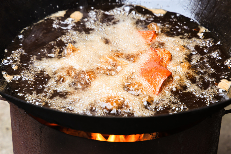 △将熟肉块轻轻放入沸腾的油中炸至金黄色