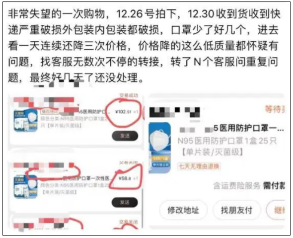 在A商家该款N95口罩的评论区,有买家称,该款口罩一天曾经一天降价3次。据其晒出的订单截图显示,其在2022年12月26日下单,一盒25只价格102.51元,12月30日上午发现该款口罩一盒的价格已降至81.6元,后来发现这个价格再次降为61.9元(实付47.4元),当天下午发现第三次降价时,一盒的售价是58.8元。