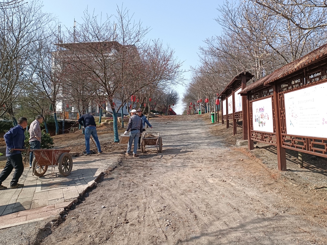 走进桂阳樱花园大门,工人们挥舞着铁铲、推着斗车,忙着平整入园道路,准备铺设沥青路面。