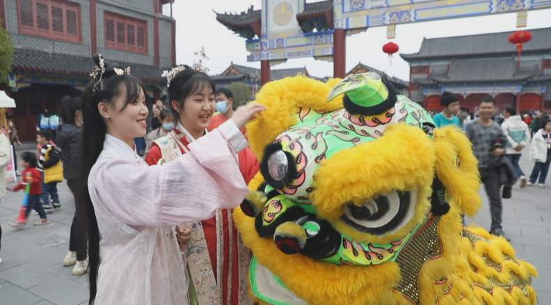 在县文化园古郡城内,人声鼎沸,龙狮共舞闹元宵节目喜庆上演,鼓乐相伴,龙珠牵引,通过脚步和手势变换,两条金龙翻滚腾跃、盘旋飞舞。舞狮队辗转腾挪、上下跃动,在阵阵锣鼓声中走街串巷,精湛技艺赢得现场观众的阵阵喝彩。汉服走秀《礼仪之邦》、汉服舞蹈《天涯共此时》、古风器乐演奏《生生世世爱》等传统节目精彩上演,引领游人梦回中华民族繁荣昌盛的历史篇章。