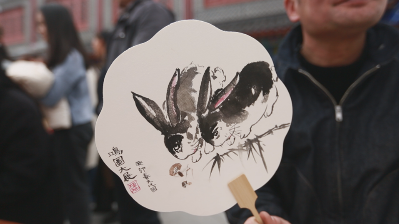 庙会上,各式各样的“兔”元素现身。舞台上,数只灵动可爱的“瑞兔”抱起中国结表演舞蹈,呈现瑞兔奔新春的美好寓意。台下,国画爱好者拿起毛笔,蘸取墨水,以淡墨勾兔形,浓墨勾眼睛,中墨点写背景,写上祝福寄语,让一只只水墨“福兔”跃于扇面上。