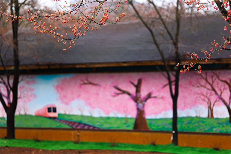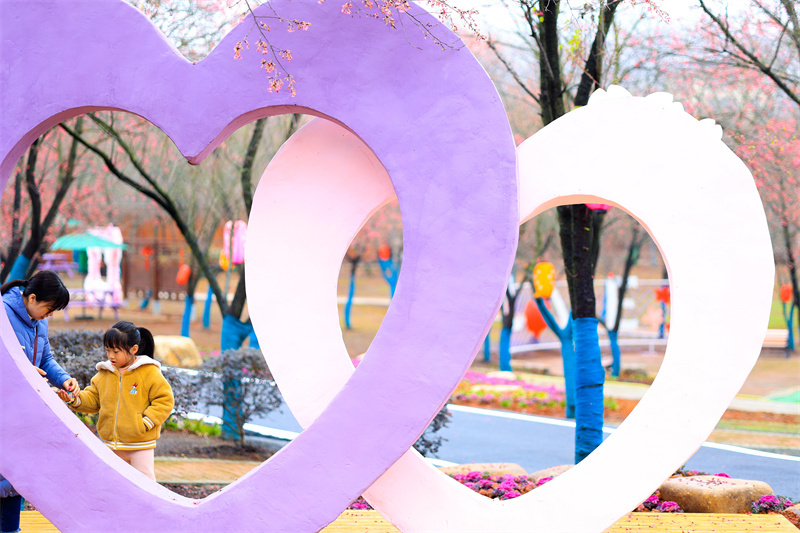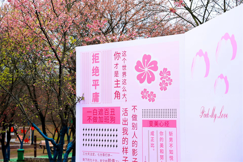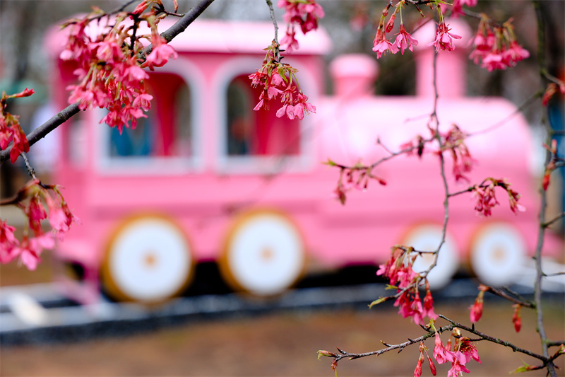 樱花小径上,纷纷簌簌,行人漫步其间感受着春的气息。樱花园内新增设的打卡点,普遍以粉色为主色调。粉色的小火车、休闲椅、爱心造型、各式相框、未来驿站、爱情长廊……让人沉浸在别样浪漫情怀中,忍不住在花影间、打卡点留下最美瞬间。
