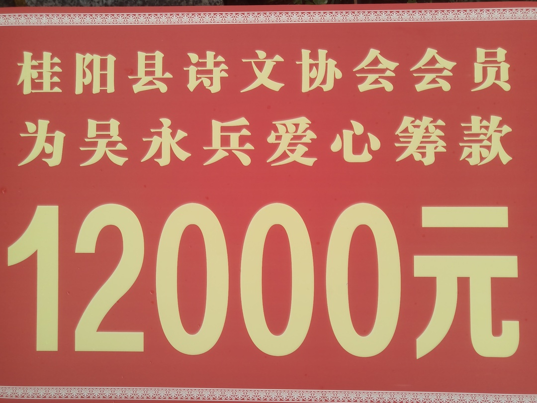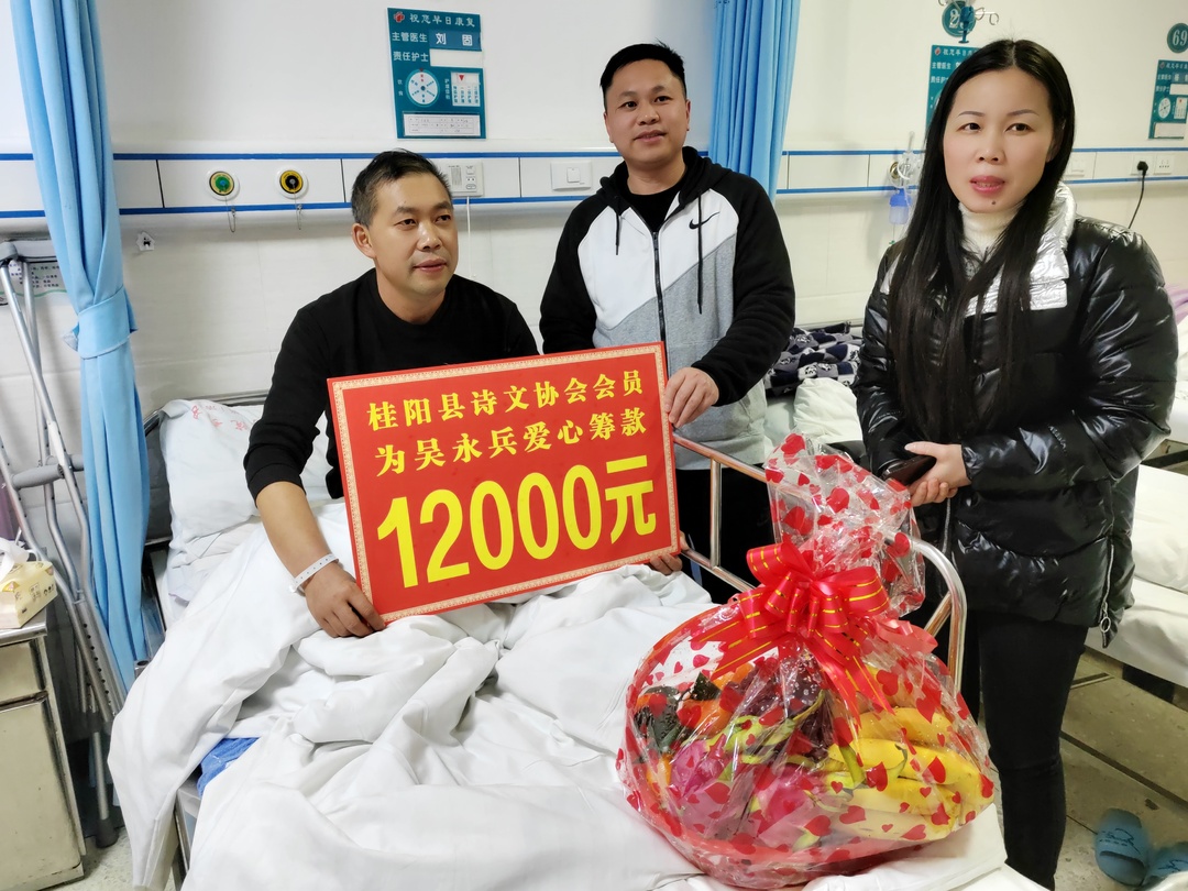 吴永兵收入微薄,后期的康复治疗还是一个未知数,面对巨额的治疗费用家里人一筹莫展。一方有难,八方支援,在得知情况后,桂阳县诗文协会会长黄承智第一时间在诗文协会会员群发出为吴永兵捐款的倡议,号召大家为协会的优秀会员吴永兵献爱心。在短短的几天时间里就有100多位会员捐出爱心善款12000余元。