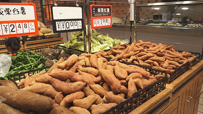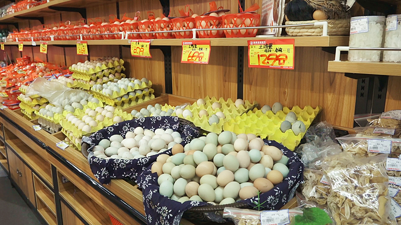 除了季节性蔬菜,麒麟瓜、黄花梨、夏黑葡萄、黄桃、土鸡蛋土鸭蛋等各种本地水果、农产品纷纷摆上超市货架,丰富了市民的菜篮子。超市为了保鲜还备有大型冷库储存,以确保不缺货断货。