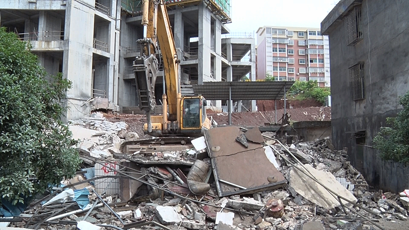 当天上午,10个行动小组分工合作,同时启用大型挖掘机和喷水车对现场进行施工,共拆除5栋房屋建筑,拆除面积约为1300平方米。