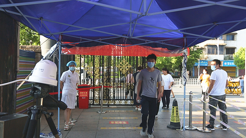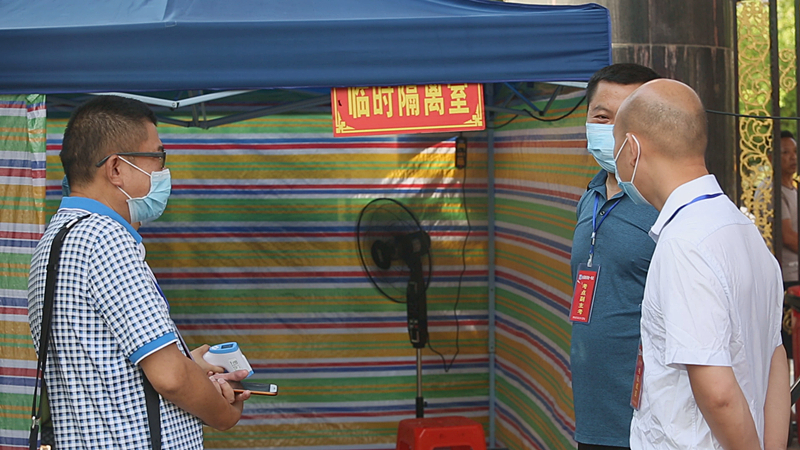 早上7点30分,在桂阳一中考点入口处,所有进入考点的考生和考务人员正在进行红外线体温测量,体温低于37.3℃方可进入考点。7:50分左右,一考生体温高于37.3℃,经临时隔离点水银温度计和手持体温枪再次测量无异常后,顺利进入考场。考试期间,如遇身体不适的考生,防疫医卫组工作人员将安排考生到隔离室休息后,再由防疫副主考判定是否启用备用考室。