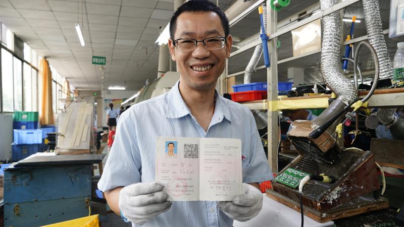 “你看,如果像这样焊点链接在一起就是不良品。像这样有空焊,也是不良品。” 肖卫兵介绍,一开始上岗时,不良品很多,经常需要返工重做。通过这几年的学习,出现不良品的概率已经大大降低。工作效率也实现翻番,从原来一个小时加工800多件到现在已经可以加工1500多件。现在说起焊锡来,他俨然是个行家里手。