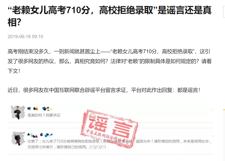 辟谣文章:“老赖女儿高考710分,高校拒绝录取”是谣言还是真相?