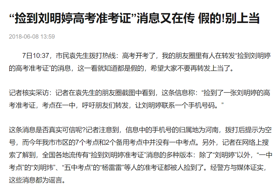 辟谣文章:“捡到刘明婷高考准考证”消息又在传 假的!别上当
