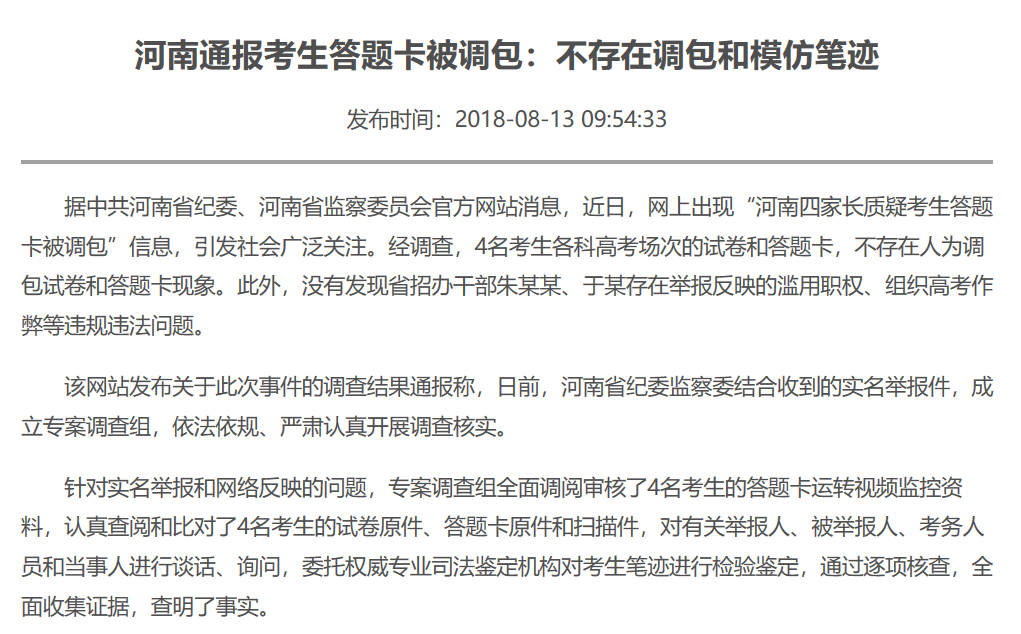 辟谣文章:河南通报考生答题卡被调包:不存在调包和模仿笔迹