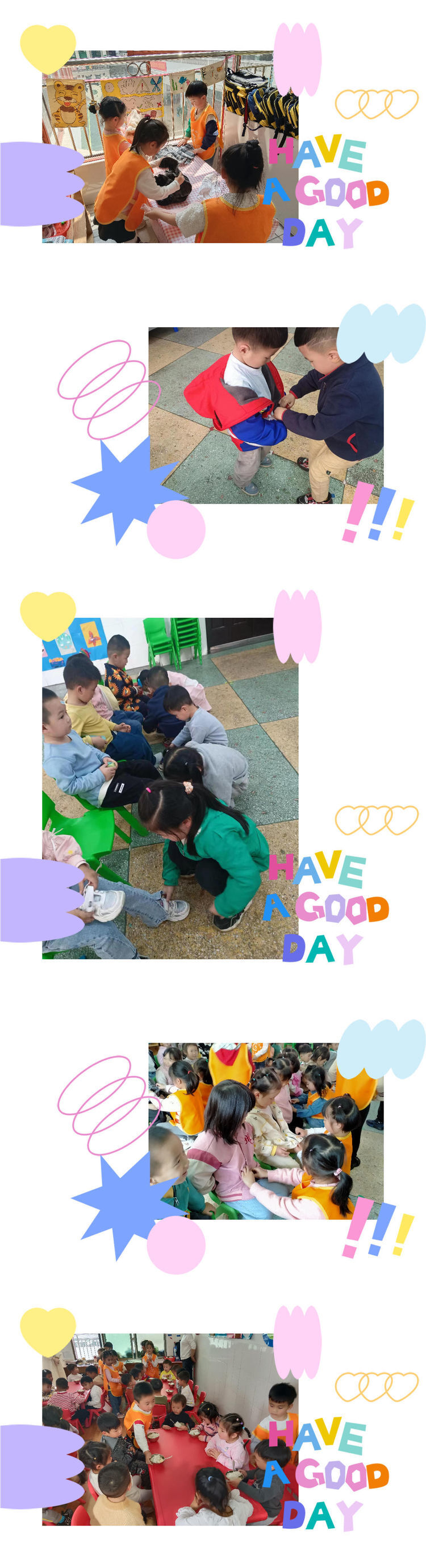 中班的小朋友们化身为“小小志愿者”,来到小班幼儿的班级,帮助小班的弟弟妹妹整理衣服鞋子、端饭菜等等。