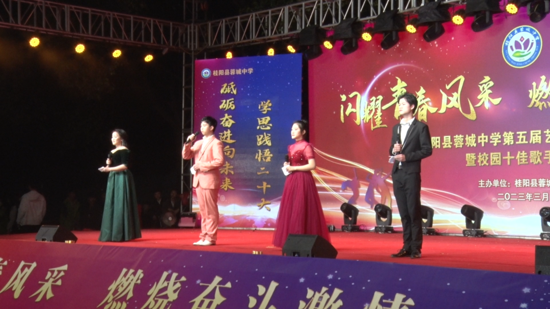 新桂阳3月22日讯(实习记者 张珂荣)3月20日晚,蓉城中学举行第五届“闪耀青春风采 燃烧奋斗激情”校园艺术节文艺汇演暨校园十佳歌手大赛。