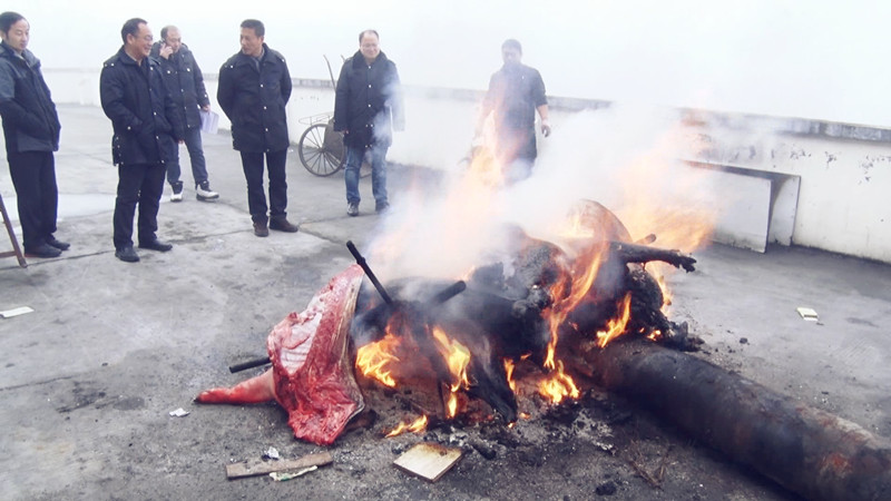县畜牧兽医水产局检验检疫站站长 肖建松:我们畜牧水产局为了让广大市民吃上放心肉,派出检验员到屠宰场24小时值班,进行检验检疫。通过严格的三道关检验,从屠宰场出去的肉绝对是健康、放心的肉。