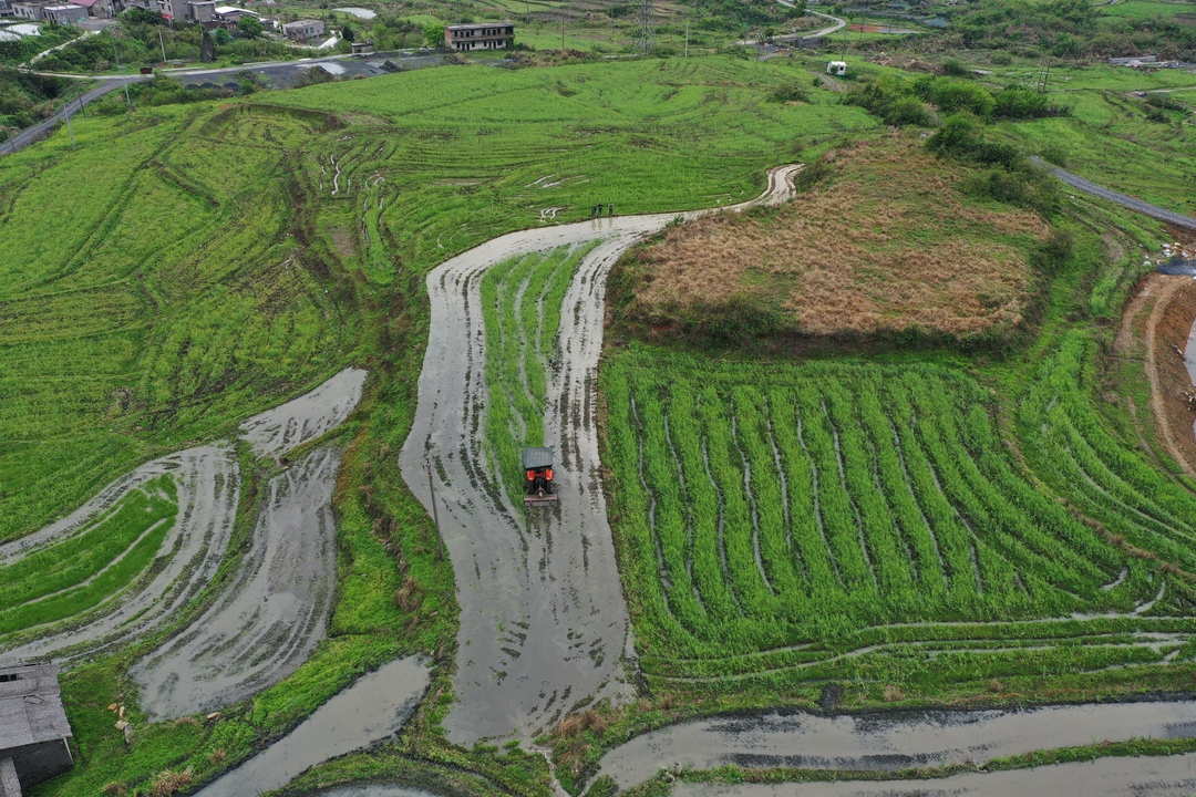 在荷叶镇,连片的紫云英、油菜花盛开在梯田之上,千万朵紫、红、白、黄相间的花朵儿摇曳生姿,连绵成花海,让春日的田野平添几分诗意。伴随着隆隆机械声,农户们驾驶翻耕机在田间来回翻耕,油菜和紫云英作为绿肥被翻进土壤里,它们将成为这片农田上水稻种植的重要营养来源。