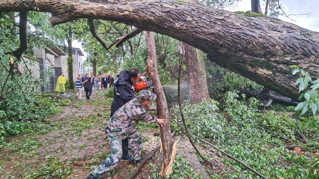 由于枝干较长且粗,当地应急队伍、民兵使用电锯对树木进行分段切割,对准备锯断的枝干进行固定,采取下拉上拽的方法,逐段转移树干树枝。不少村民自发加入抢险队伍,清理锯断树枝。
