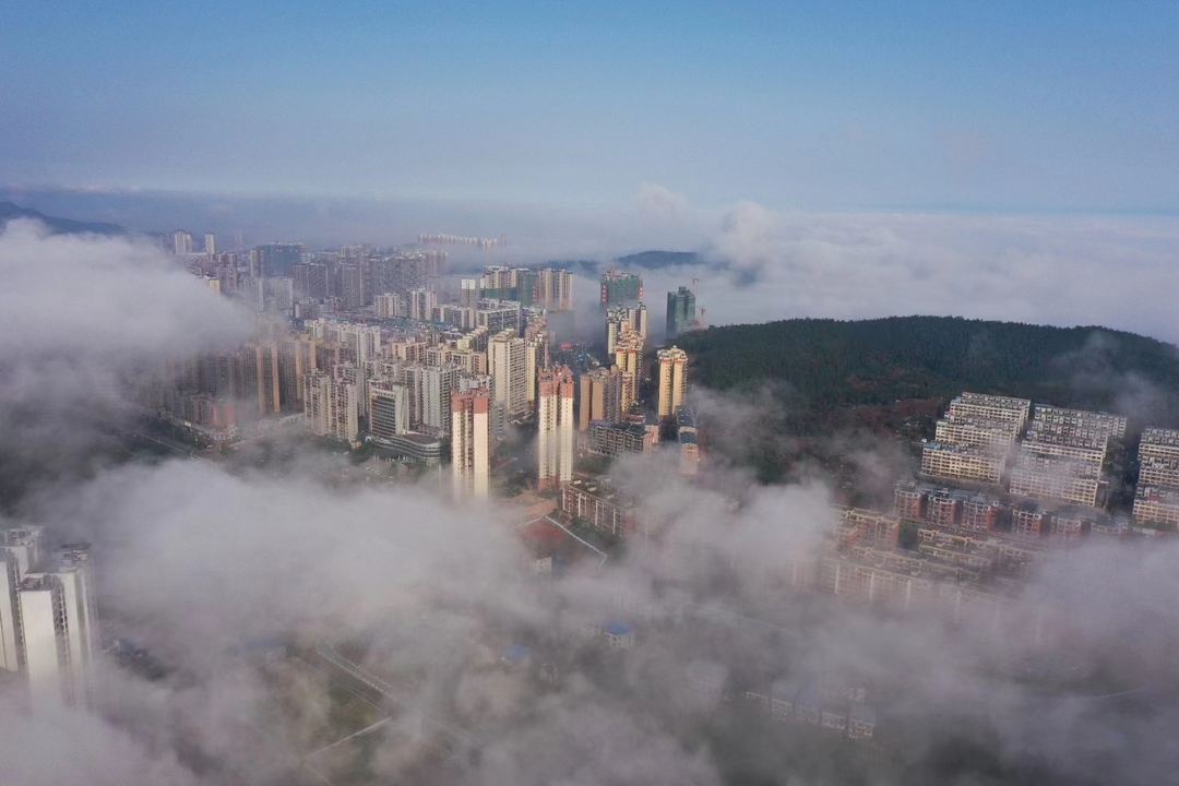 从高空俯瞰,连绵起伏的群山、古色古香的城楼,似乎在飘忽的云中融为了一体,如缥缈的天宫,又如遗落人间的胜景。