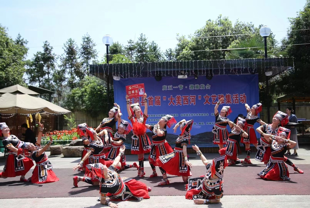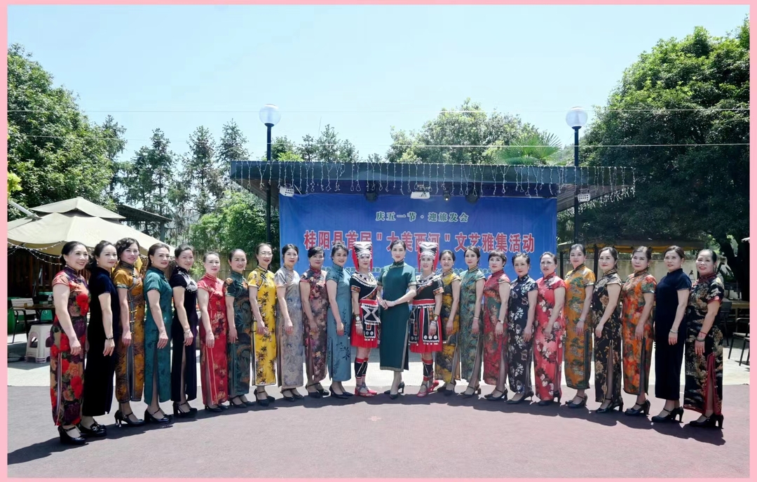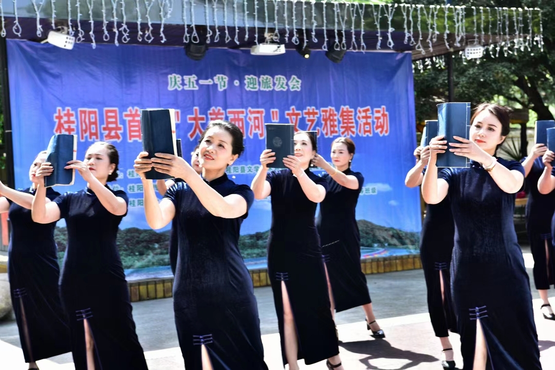 新桂阳5月4日讯(记者 唐和丹)近日,由桂阳县传统文化促进会举办的“庆五.一、迎旅发会:桂阳县首届“大美西河”文艺雅集活动”在西河风光带正和镇和谐村“在水一方”音乐农庄华丽上演!来自县老年大学舞蹈班、形体礼仪班、书画班、器乐班和太极班的学员以及县传统文化促进会的部分会员,纷纷登台亮相,为现场观众和广大游客展示了丰富多彩的民族舞、旗袍秀、器乐演奏、太极拳剑以及书法结画表演,让观众和游客切身感受了传统文化的艺术魅力,分享了一场华彩多姿的传统文化艺术盛宴。