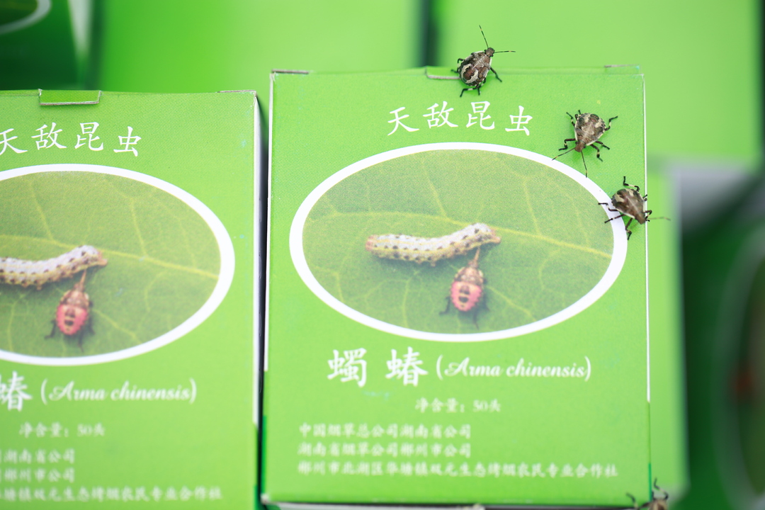 县烟草公司烟叶生产经营分部农艺师李思军介绍道,“蠋蝽他是一种捕食性益虫,释放到大田里主要是防治青虫和斜纹夜蛾幼虫,提高作物安全性,减少农药使用量,每亩释放量大概到二十到五十头。”