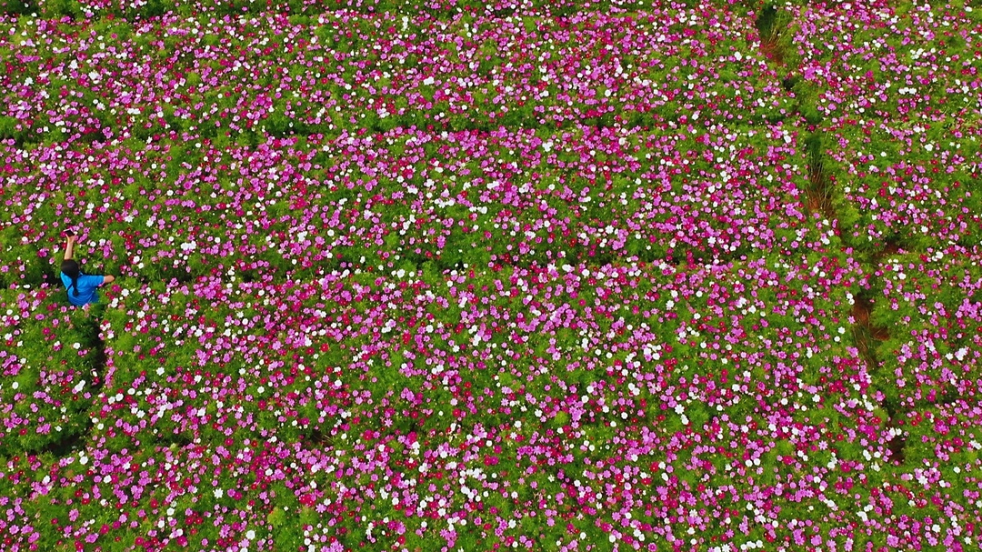 高空俯瞰,百亩格桑花像是铺在地上的“五彩地毯”,美得让人移不开眼。近赏格桑花,清雅馨香,悦目怡神,深浅层叠、五彩斑斓,汇聚成一片绚丽花海。