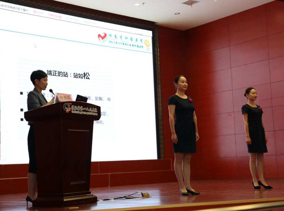本次培训特别邀请到了湖南省肿瘤医院护理部护理专家、主任护师、ACI注册国际高级礼仪培训师胡美华以及宋彩云、张健、辜梦聃四名专业培训老师为大家进行培训授课。在上午的礼仪培训课中,胡美华和宋彩云老师分别以《人际沟通理论在卓越护理中应用》、《卓越服务之医院窗口礼仪》、《有礼有位——解读生活中的位置礼仪》、《接待礼仪》为题,紧扣卓越护理和卓越人文这一核心目的,结合丰富的案例以及日常工作和生活中的情景模拟,重点对与会人员开展了沟通理论、沟通技巧、形象礼仪、体态礼仪、行进位次礼仪、电梯位次礼仪、接待礼仪、介绍礼仪、握手礼仪等方面的基本内容和操作规范进行了深入浅出的讲解。在理论培训过程中还穿插了站姿、坐姿,指引礼仪、用语礼仪、电话礼仪等礼仪规范的现场示范展示和医院礼仪师资学员的分组演练。分组展示环节,老师们对学员出现的错误一一指出并规范动作。形体展示环节,辜梦聃和张健老师着装整洁端庄,妆容清新自然,仪表举止落落大方,一招一式有条不紊、规范得体,充分诠释了内在修养和外在表现的高度统一,让在场的学员们切实感受到:礼仪在温暖患者的同时,亦是自我身心的一个提升。