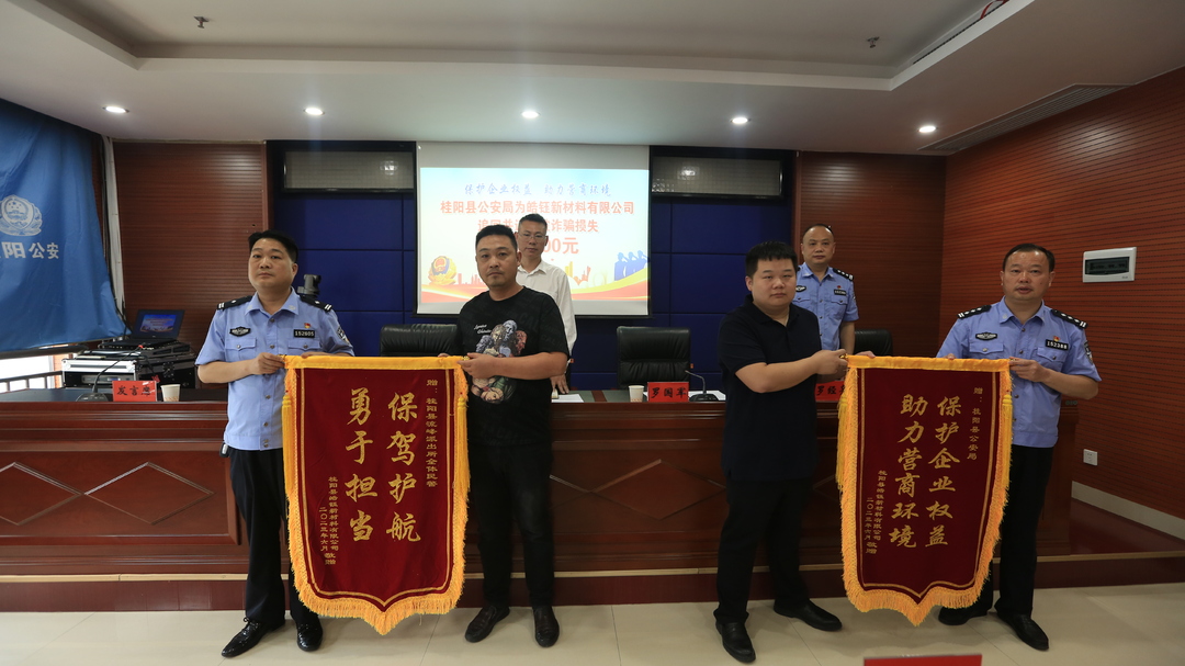 6月6日,县公安局举行被诈骗损失返还仪式,为桂阳某新材料公司返还钱款55.8万元。企业代表分别将“保护企业权益助力营商环境”和“保驾护航勇于担当”两幅锦旗送给县公安局和流峰派出所,表达诚挚谢意。