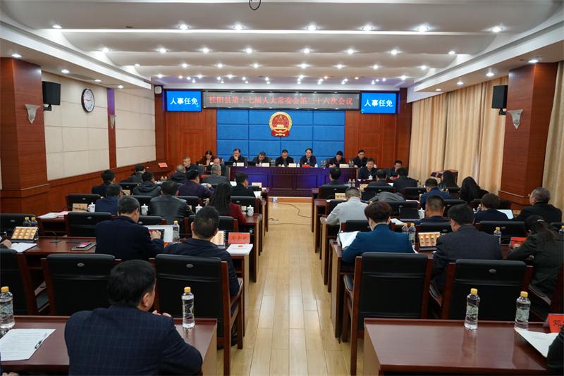 新桂阳11月18日讯(记者 邱龙飞)11月18日,县第十七届人大常委会第二十六次会议召开,会议通过了有关人事任免,听取审议了县政府关于实施河(湖)长制工作情况的报告等。县人大常委会党组书记、主任邓芳斌主持会议,县委副书记、县长朱阳辉参加会议并向会议提请了有关人事任免议案。