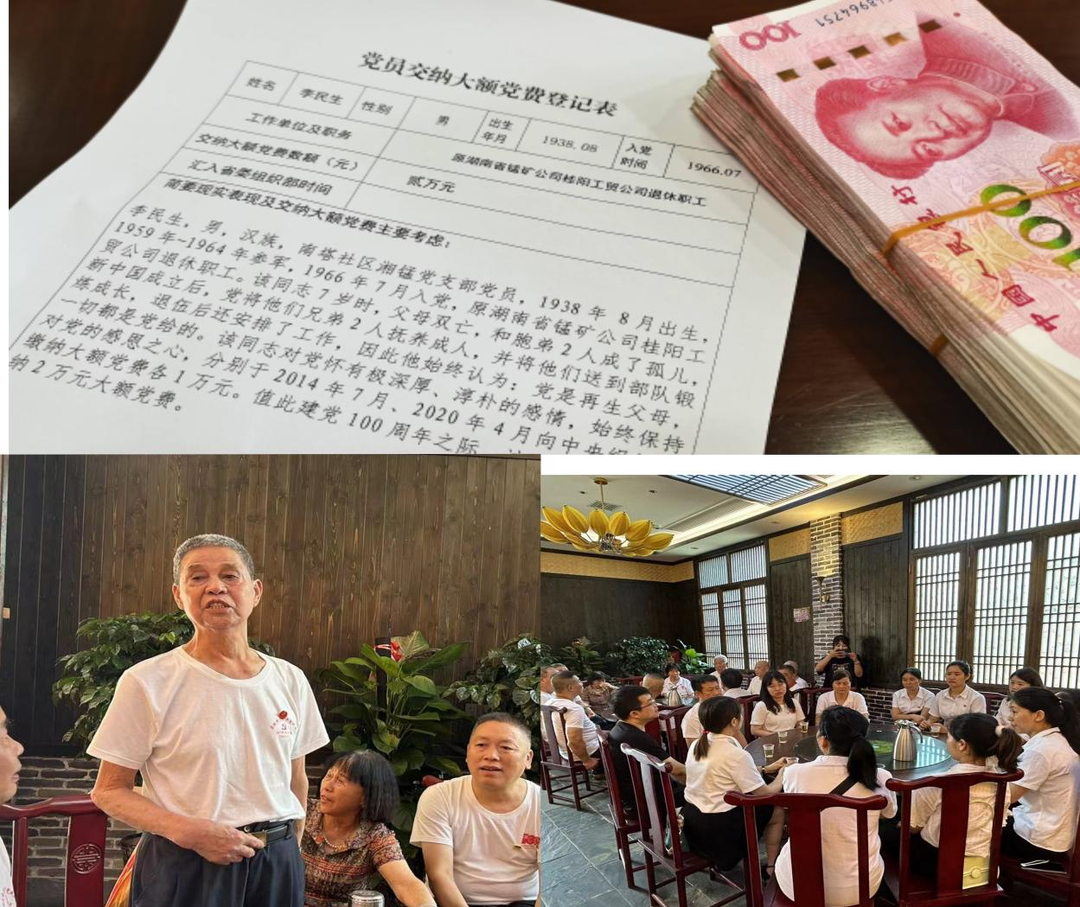 桂阳,是一个有着丰厚红色教育资源的地方,先后涌现了不少革命仁人志士。今天,我们鹿峰街道南塔社区湘锰党支部的党员讲述了支部老党员——85岁的李民生大额交党费的故事:李民生1938年8月出生,新中国成立后,参军入伍,在军旅生涯中光荣的加入了中国共产党。在2014年和2020年,李民生两次交纳大额党费,每次1万元。在中国共产党成立100周年之际,他再次交纳2万元大额党费。李民生在活动现场感慨发言,“共产党对我的恩情让我说上三天三夜也说不完,我受了党恩,如今生活条件较过去好了,我要回馈党恩。缴纳的党费能对社会有所帮助,我打心里开心,身为老党员的我一定会教育好子女,为党、为社会作贡献。”