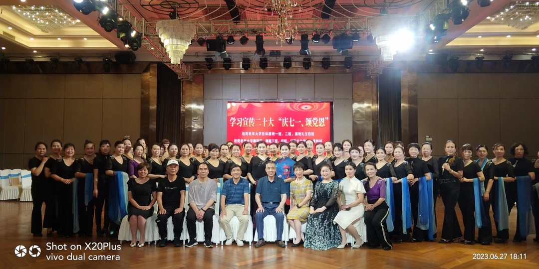 新桂阳7月3日讯(记者 唐和丹)为贯彻落实宣传党的二十大精神,庆祝中国共产党成立102周年,向伟大的党献上最诚挚的祝福,在七一建党节来临之际,县老年大学形体模特一二班、旗袍礼仪四班、舞蹈三四班以及太极拳班的学员们欢聚一堂,隆重举行“庆七一、颂党恩”暨2023年上学期结业汇报演出,歌颂党,歌颂祖国,歌颂我们美好的新生活。